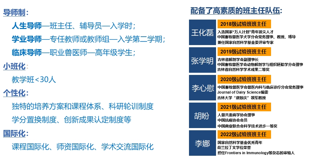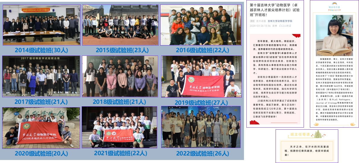 2014年试办卓越人才培养试验班,实行“一制三化”:导师制、小班化、个性化、国际化,现组建10期,累计237名学生,目前读研率为98%,出国交流率41%,科研参与率100%,发表SCI论文影响因子总数154.95,获国家级竞赛奖项59项。以2024届动物医学(卓越农林人才拔尖培养计划)试验班为例,班级27名学生,英语四六级通过率为100%,85%的同学被推免到清华、北大、中科院等双一流A类大学或科研院所,2人入选DVM项目,班级被评为“2023年快看漫画
