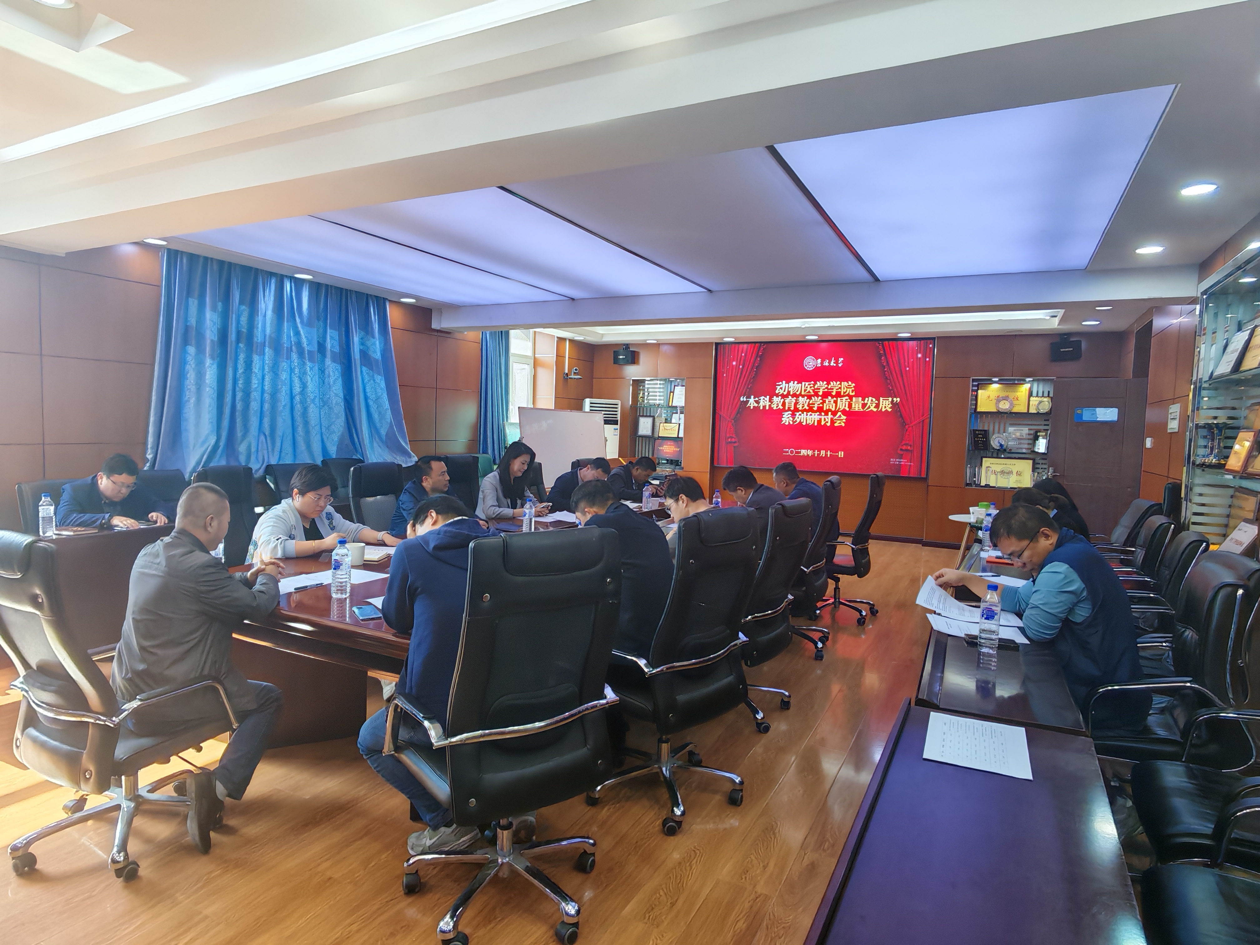 于2024年10月11日上午,在兽医楼三楼会议室,召开了“本科教育教学高质量发展”系列专题第三场研讨会,学院领导、教学委员会全体委员和各系主任参加了会议。会议由贺文琦副院长主持。